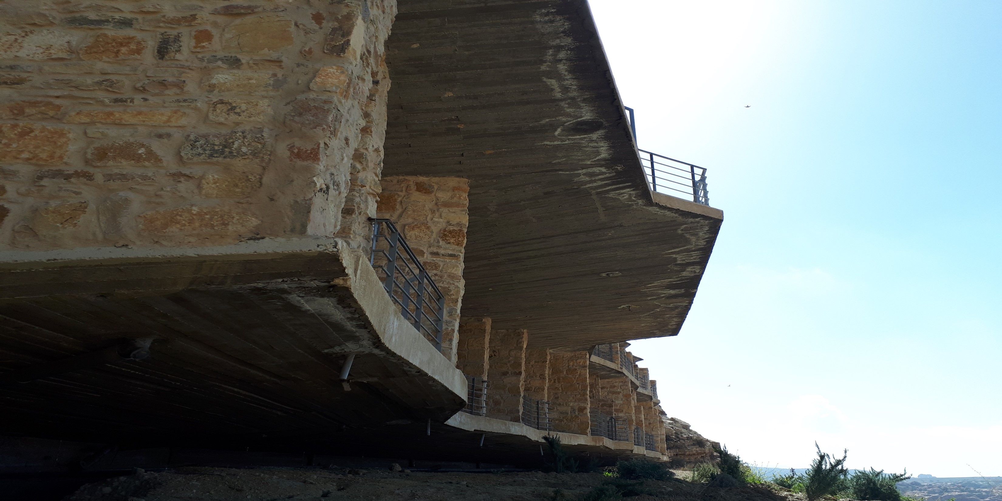 Dana Guesthouse is perched on a cliff within the Dana Biosphere Reserve. Its unique design incorporates suspended and cantilevered sections to overcome unstable soil. The building's appearance mirrors a half-eroded pomegranate, blending with its natural surroundings. It currently offers 9 hotel rooms, with plans for a future extension of 16 more rooms along the cliff.view more