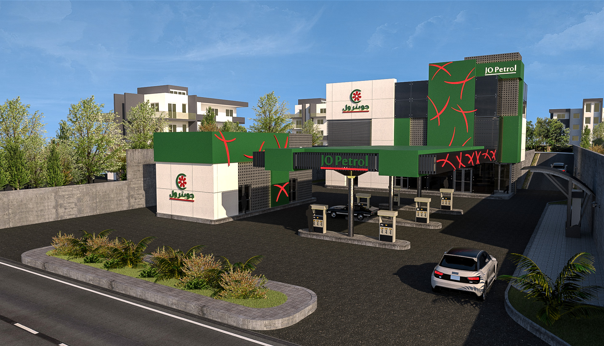 This is a car fuel station consisting of steel and concrete, and there is also a supermarket for convenience along with a variety of shops providing car maintenance services.