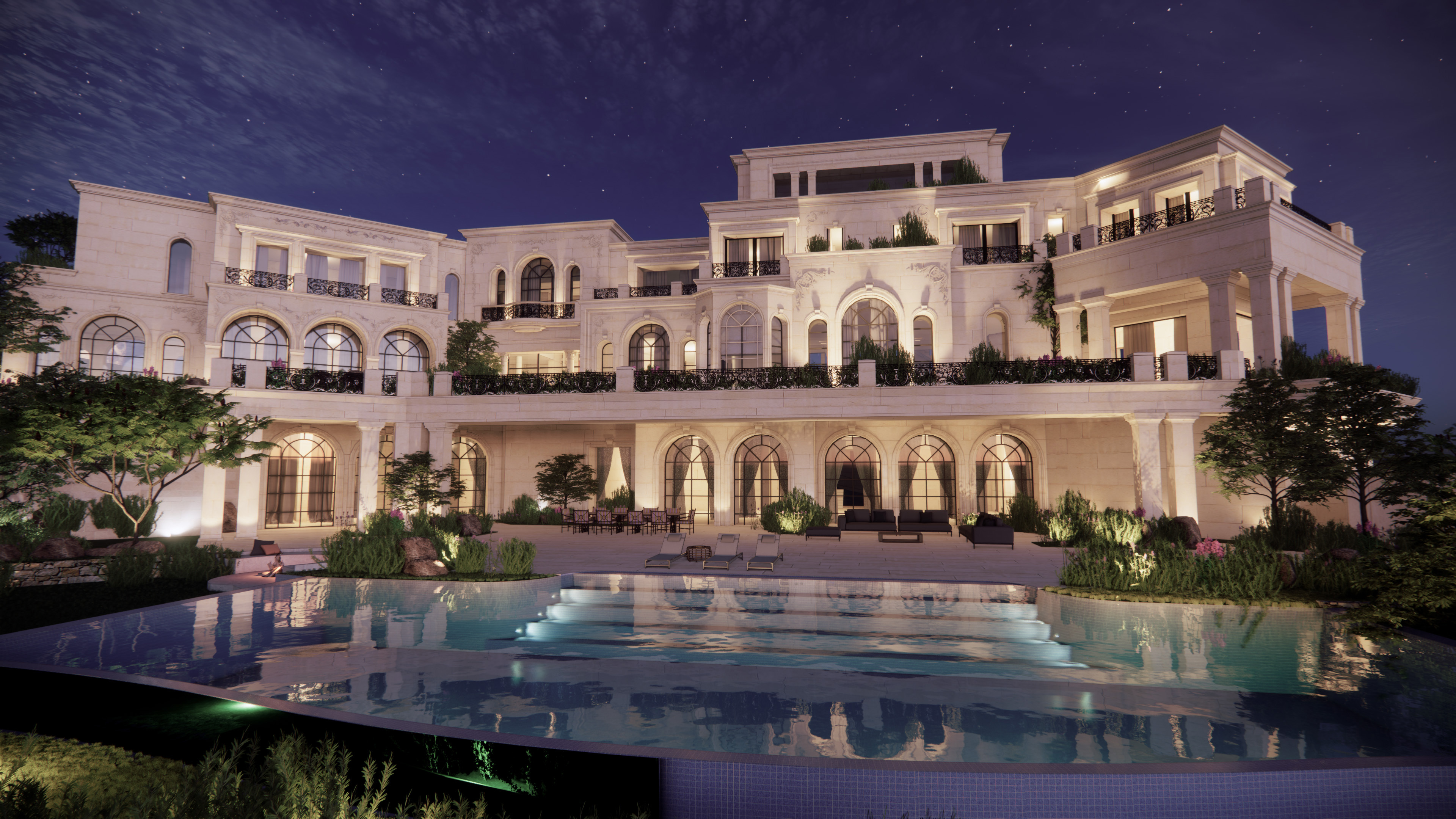 This high-end, luxurious private villa boasts cantilevered concrete slabs extending up to 5 meters. Additionally, it features imposing retaining walls, swimming pools, water tanks, and elegant stone columns.