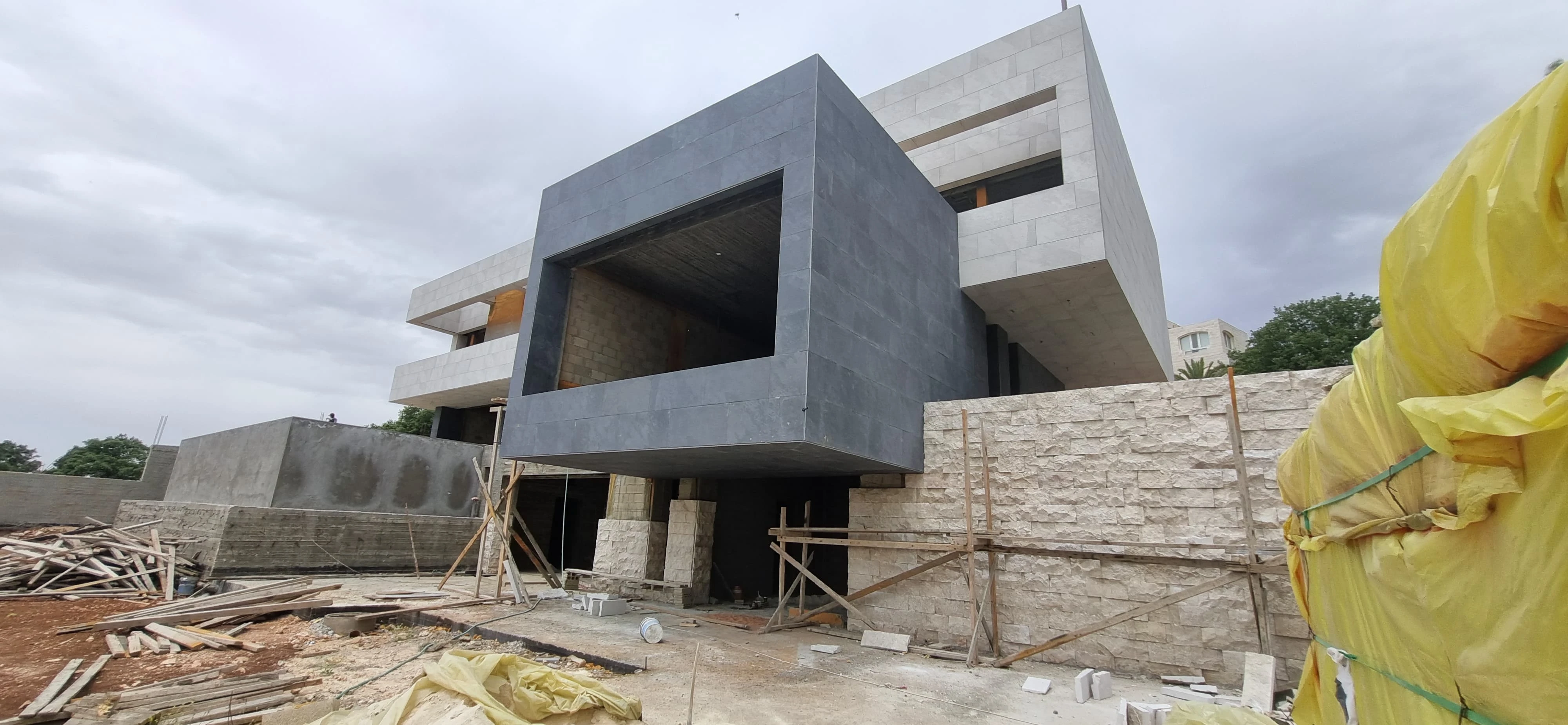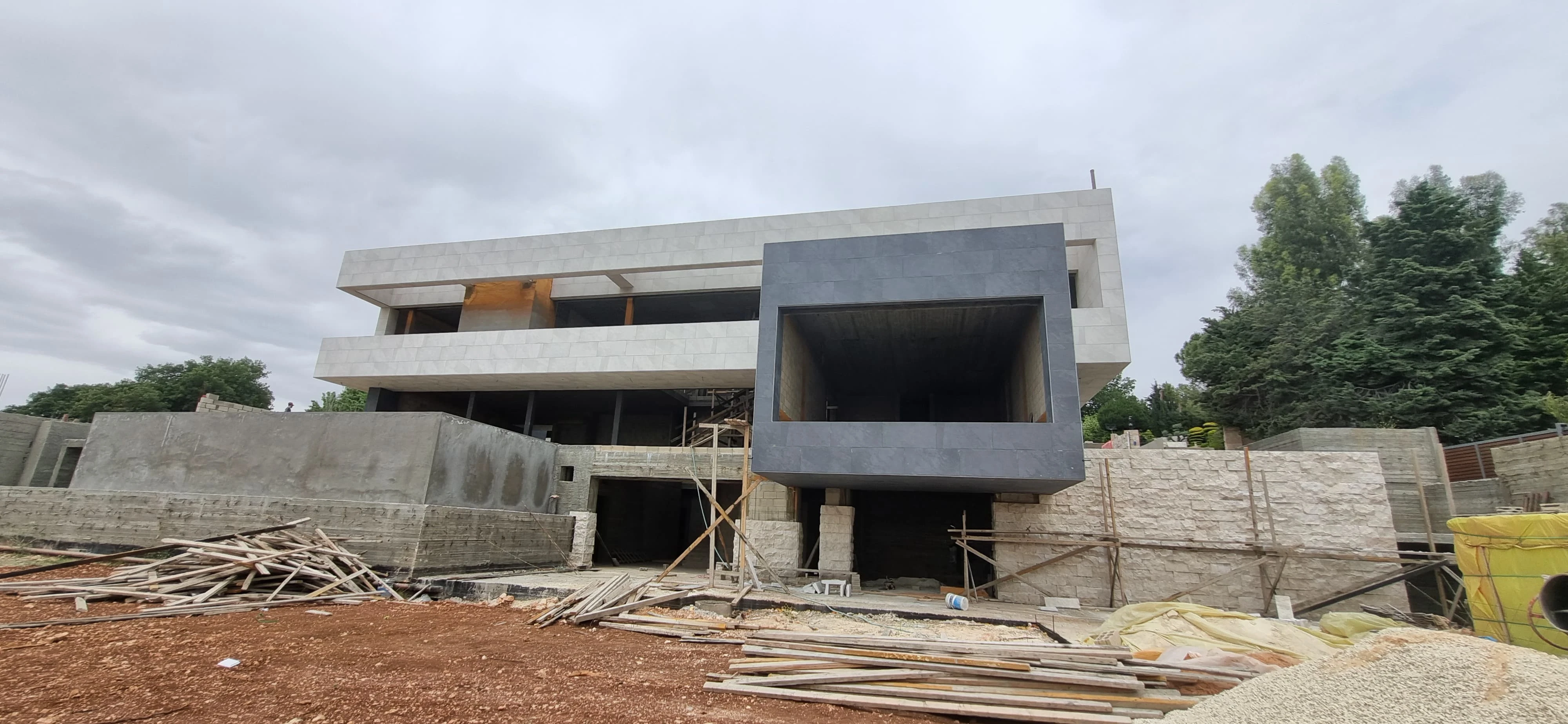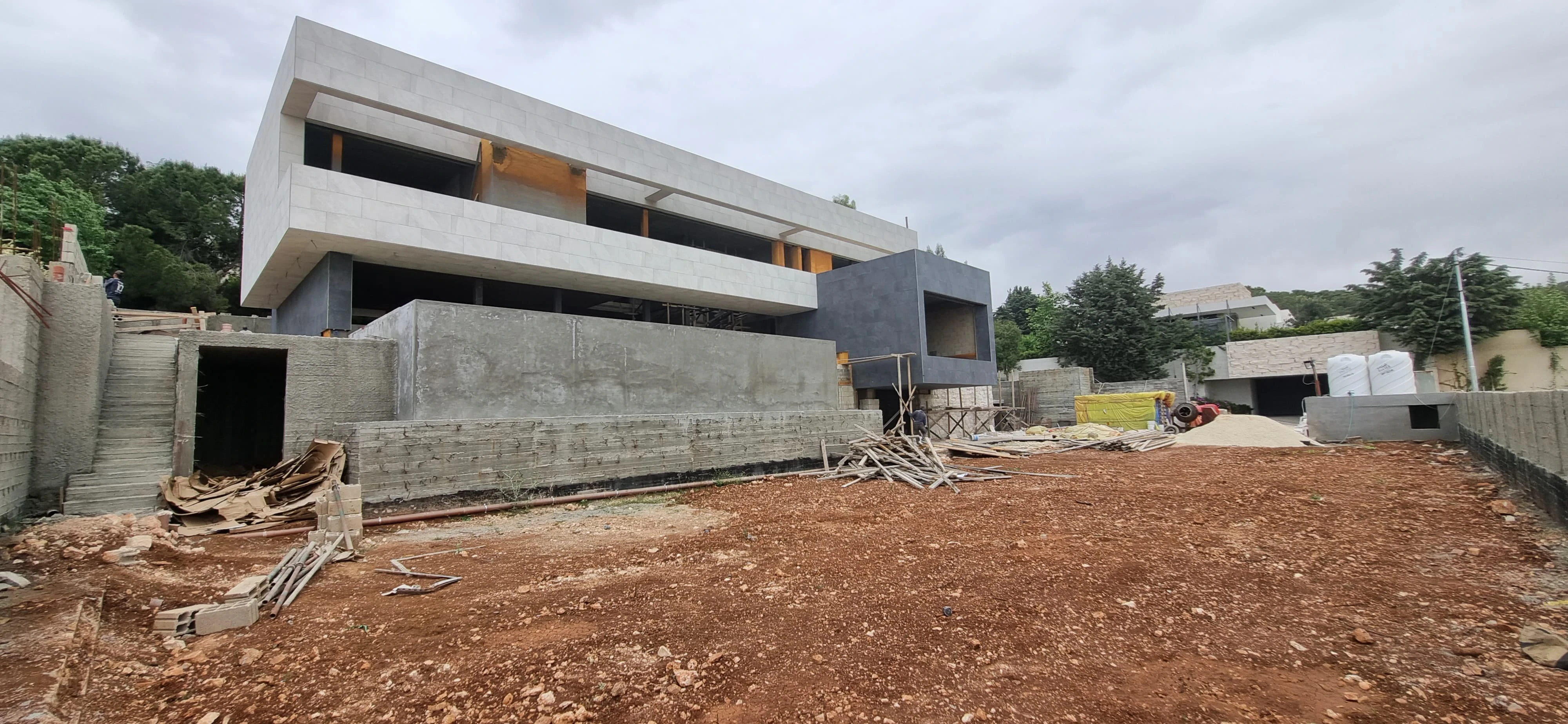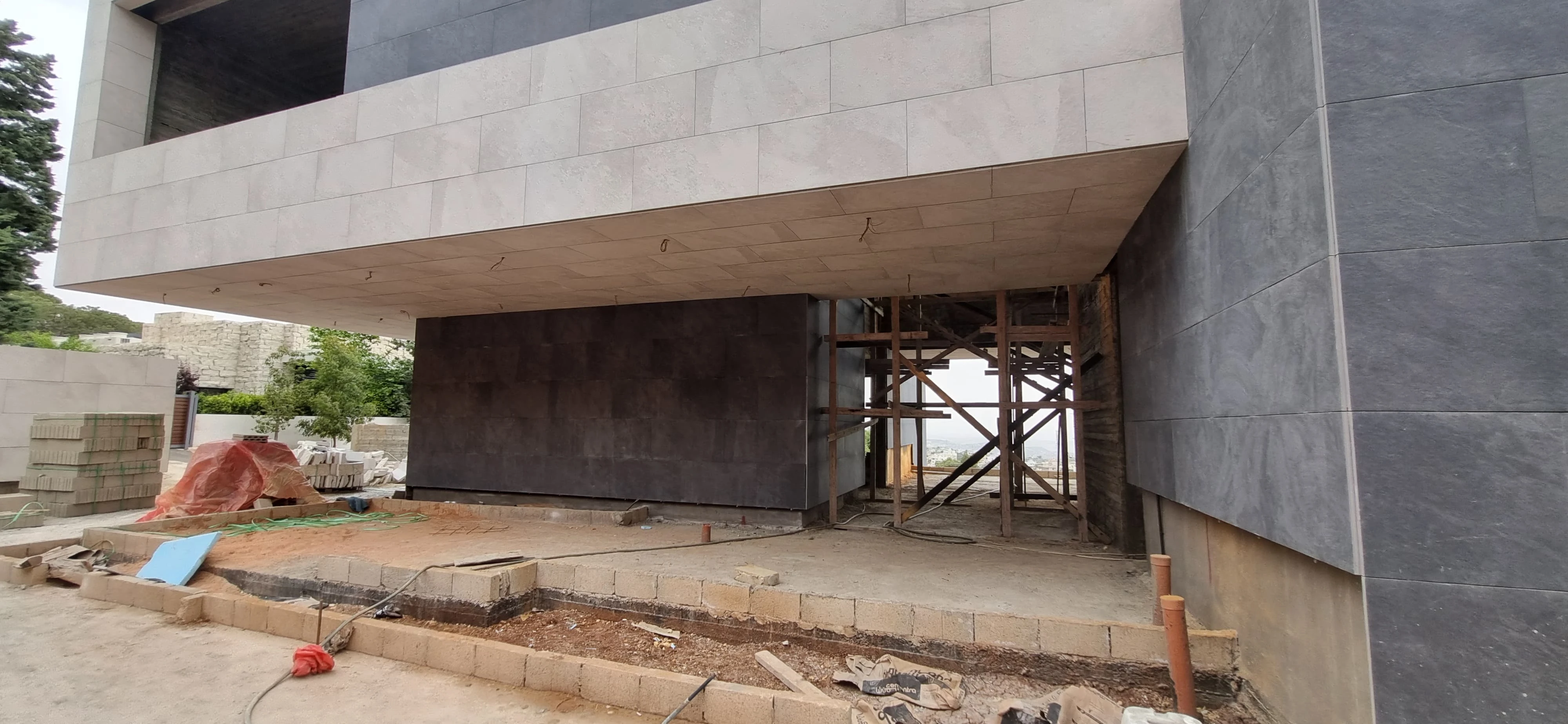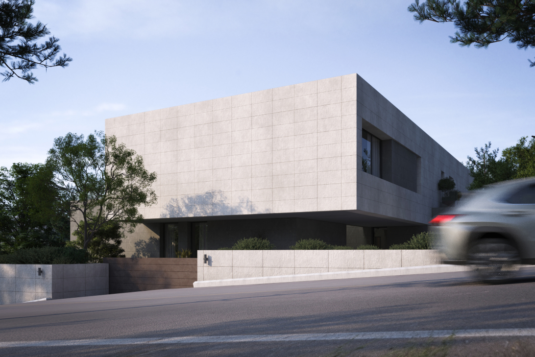 The structural design incorporates concrete slabs with spans of up to 12 meters between columns, as well as multiple cantilevered sections extending up to 5 meters. Additionally, a 32-meter-long concrete frame runs along the main facade, directly connected to structural columns via cantilever beams.