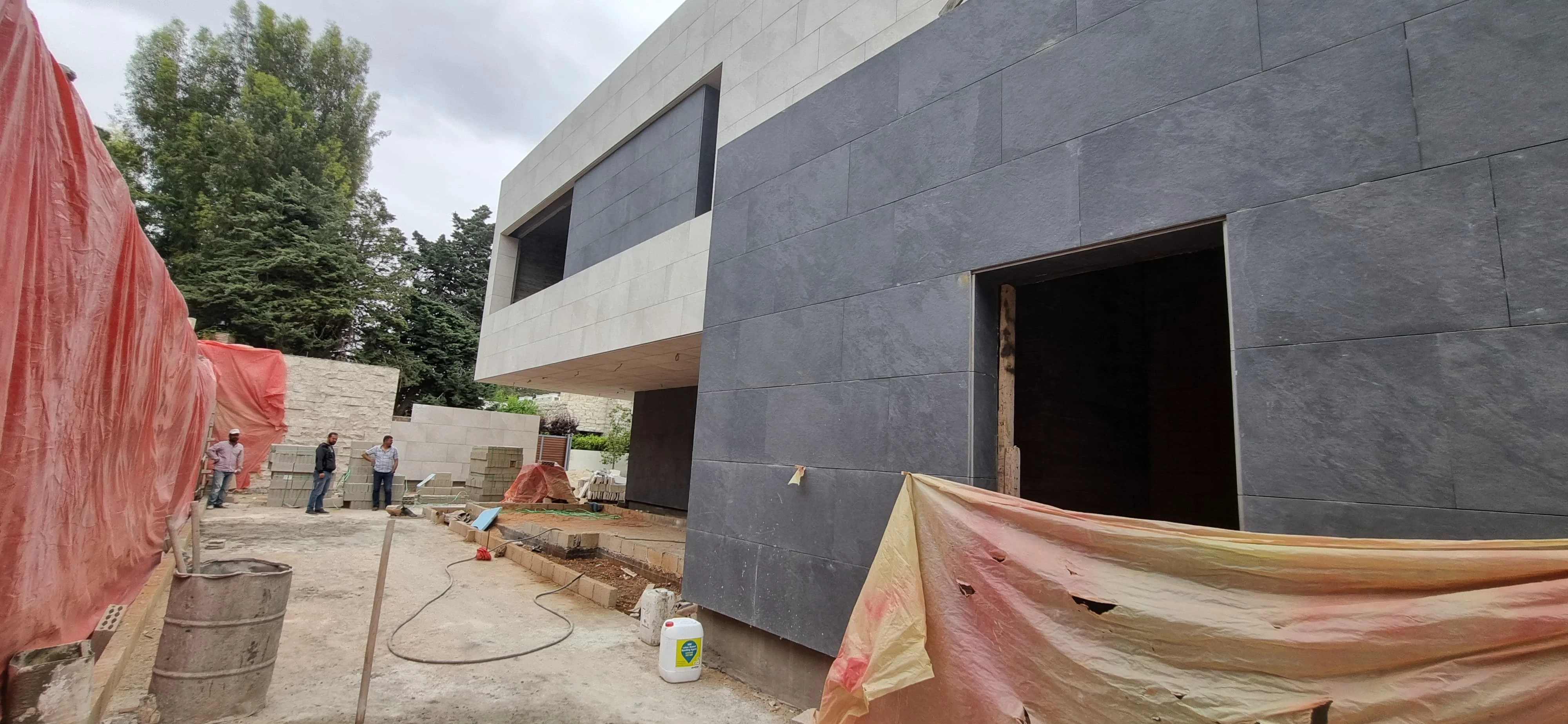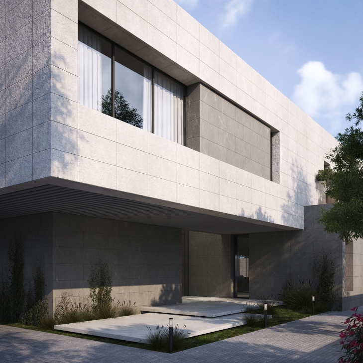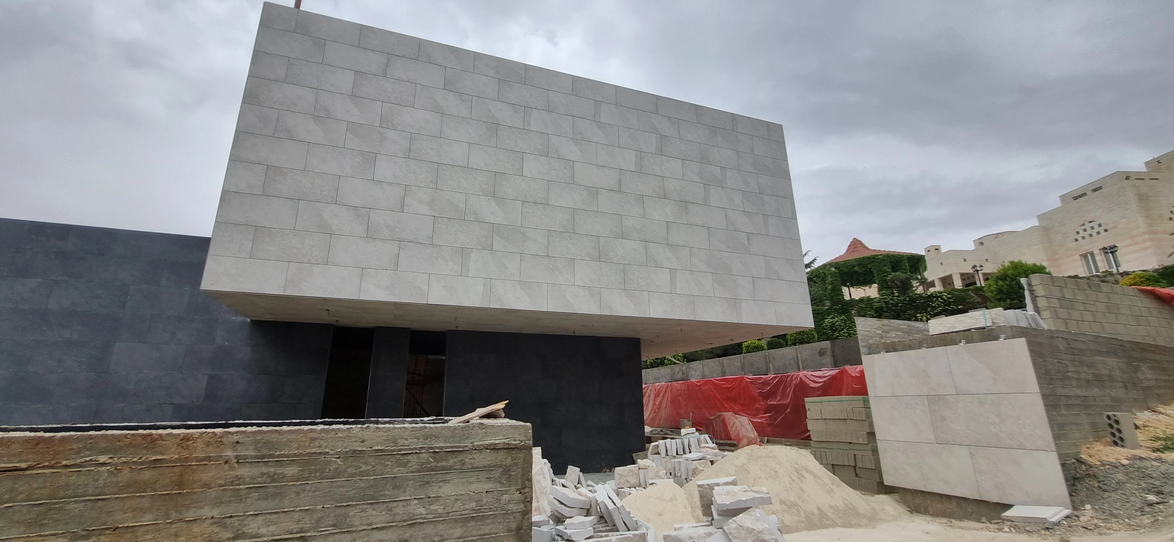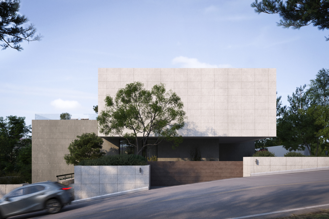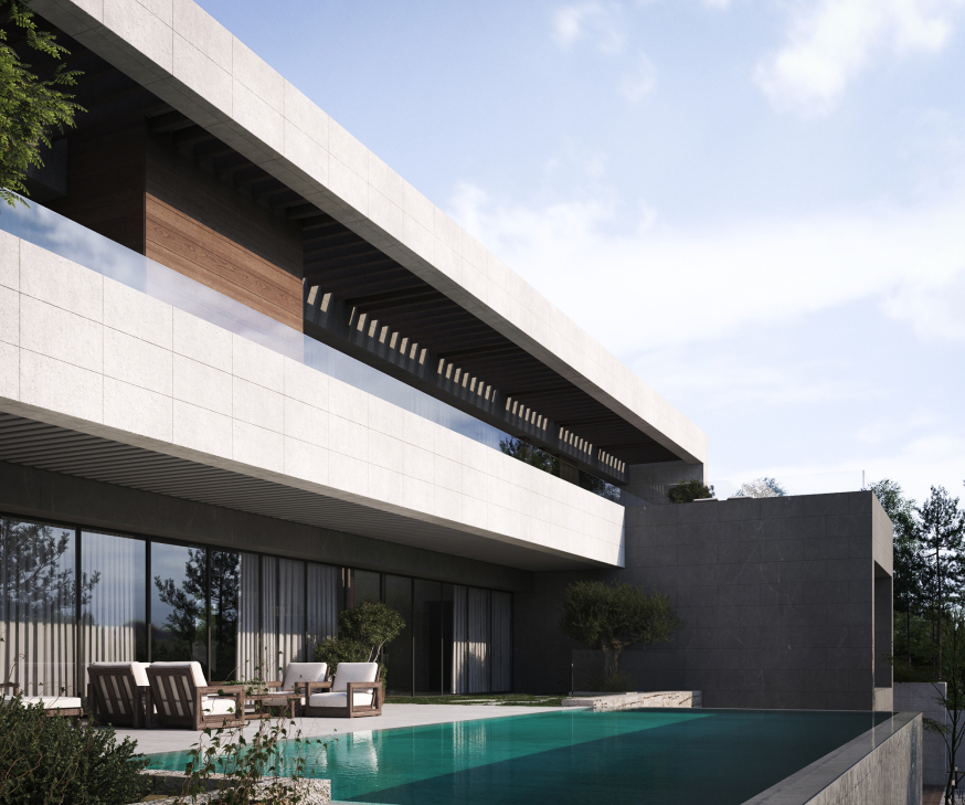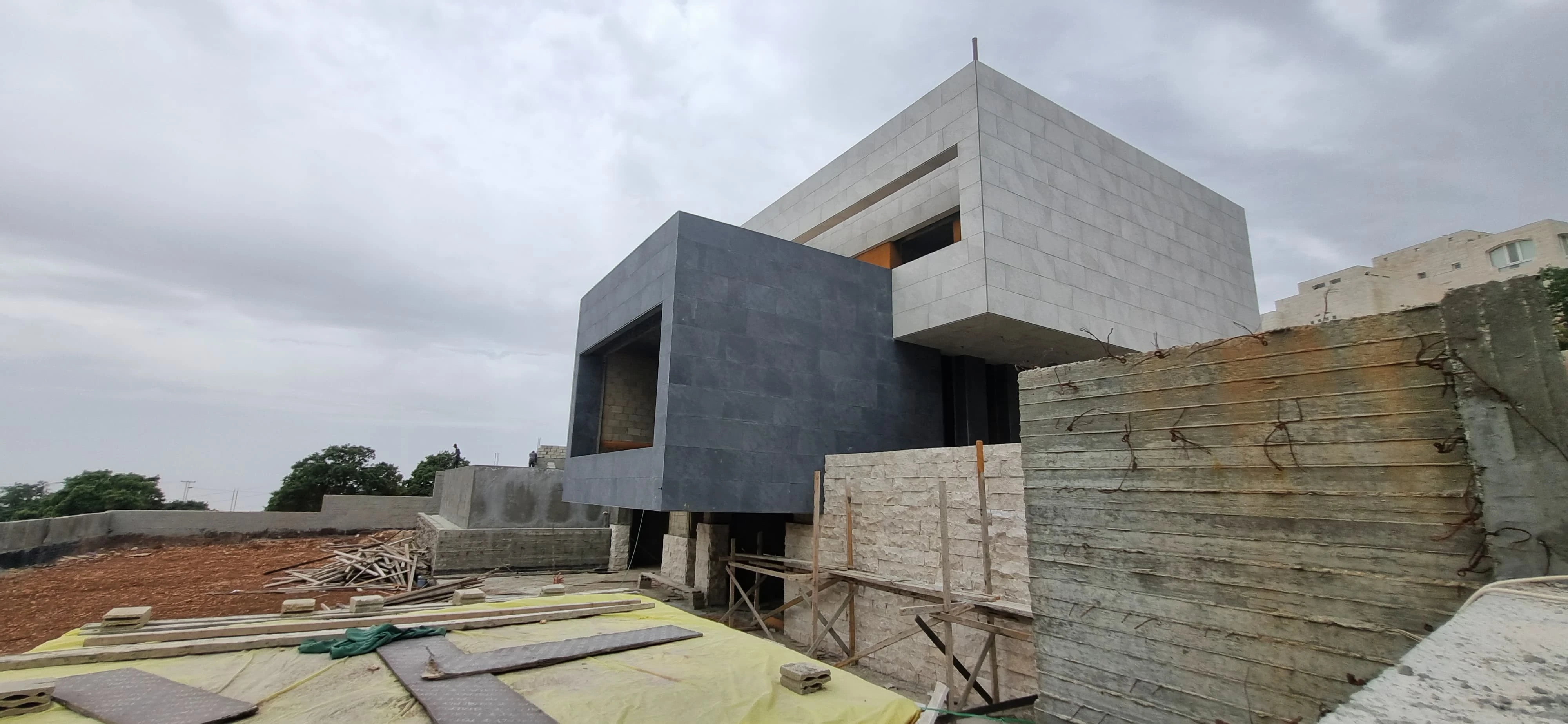 The structural design incorporates concrete slabs with spans of up to 12 meters between columns, as well as multiple cantilevered sections extending up to 5 meters. Additionally, a 32-meter-long concrete frame runs along the main facade, directly connected to structural columns via cantilever beams.